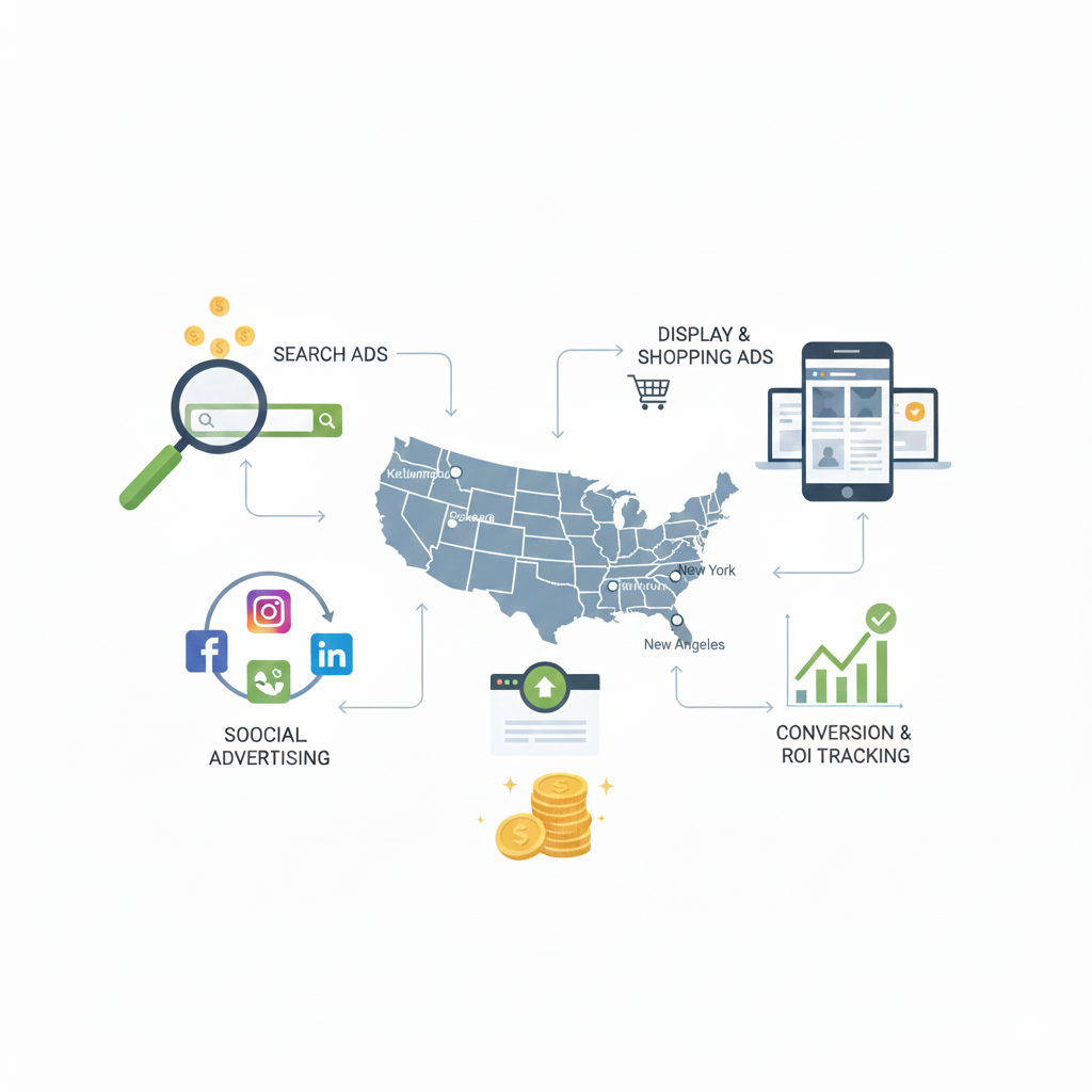 We offer complete PPC solutions including Google Ads management, social media advertising, remarketing campaigns, shopping ads, display advertising, landing page optimization, and comprehensive analytics.