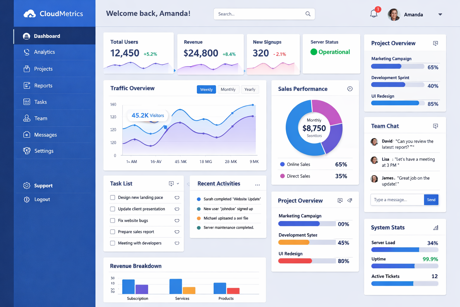 Comprehensive dashboards with real-time metrics, user behavior tracking, and actionable business intelligence.